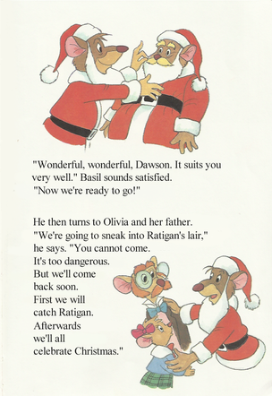 Basil and Dawson dress up as Santa Claus helpers to stop Professor Ratigan's scheme to steal money from orphanages. The book contains similar illustrations from the movie, but altered to fit with a holiday plot instead.
